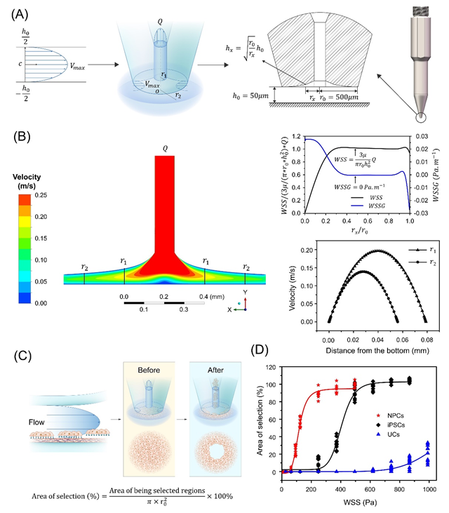 隨后,作者基于流體動力學(xué)原理設(shè)計了以可以產(chǎn)生局部結(jié)構(gòu)微流體的細(xì)胞獲取微型挑針結(jié)構(gòu)(PTMS),機械團隊克服了流場效果與多曲面加工實現(xiàn)的難題,反復(fù)校驗加工結(jié)構(gòu),最終基于PTMS產(chǎn)生的結(jié)構(gòu)微流體(PTMS-FLOW)實現(xiàn)了對基于空間限位譜系細(xì)胞的特異性挑取。此外,研究證明了PTMS-FLOW可根據(jù)流速變化在Z軸-h0的為常量的條件下,應(yīng)對不同細(xì)胞類型的粘附力差異,實現(xiàn)以無標(biāo)記、無酶活反應(yīng)參與、非侵入式、和非接觸的方式對不同譜系細(xì)胞進行特異性的選擇。該研究證明了結(jié)構(gòu)微流體是作為分離/選擇特定譜系類型粘附細(xì)胞的可自動化的技術(shù)路徑,為后續(xù)進一步研究譜系細(xì)胞單克隆的自動化獲取提供了理論基礎(chǔ)(圖2)。