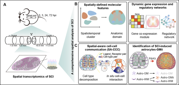 2024年7月18日,中國科學(xué)院上海有機(jī)化學(xué)研究所生物與化學(xué)交叉研究中心方燕姍課題組、中國科學(xué)院廣州生物醫(yī)藥與健康研究院彭廣敦課題組和暨南大學(xué)李昂課題組合作,在Developmental Cell期刊在線發(fā)表了題為“A spatiotemporal molecular atlas of mouse spinal cord injury identifies a distinct astrocyte subpopulation and therapeutic potential of IGFBP2”的最新論文。該研究利用空間轉(zhuǎn)錄組技術(shù)對(duì)急性損傷引起的脊髓中分子和細(xì)胞水平的復(fù)雜變化進(jìn)行了全面深入的梳理和分析,通過刻畫脊髓損傷?(spinal cord injury, SCI)后基因表達(dá)和分子變化的時(shí)空特征,以及繪制原位細(xì)胞互作網(wǎng)絡(luò)圖譜識(shí)別出一類發(fā)生特定位置遷移的星形膠質(zhì)細(xì)胞亞群,并鑒定出該亞群的特征基因之一Insulin-like growth factor binding protein 2?(Igfbp2),進(jìn)而揭示了SCI引起Igfbp2表達(dá)上調(diào)的細(xì)胞功能和潛在生物學(xué)意義。