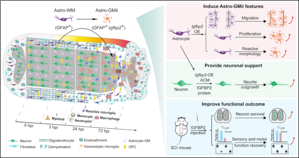 圖5?Astro-GMii細(xì)胞激活、遷移并表達(dá)分泌蛋白IGFBP2促進(jìn)神經(jīng)修復(fù)的示意圖