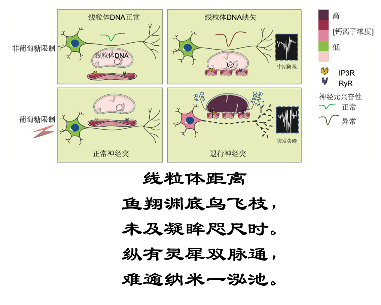 “世界上最遙遠(yuǎn)的距離,是飛鳥(niǎo)與魚(yú)的距離,一個(gè)翱翔天際,一個(gè)卻深潛海底”,世界上最遙遠(yuǎn)的距離不是飛鳥(niǎo)與魚(yú)的距離,是線粒體與內(nèi)質(zhì)網(wǎng)的距離。正是“魚(yú)翔淵底鳥(niǎo)飛枝,未及凝眸咫尺時(shí)”!內(nèi)質(zhì)網(wǎng)-線粒體接觸的距離20nm,通過(guò)兩個(gè)通道RyR、IP3R把鈣離子從內(nèi)質(zhì)網(wǎng)傳給線粒體,調(diào)控能量的產(chǎn)生;而接觸距離的異常縮短,使鈣轉(zhuǎn)運(yùn)失控過(guò)載驅(qū)動(dòng)神經(jīng)元退行,正是“縱有靈犀雙脈通,難逾納米一泓池”。 世界上最遠(yuǎn)的距離,是這樣向死而生的情非得已。