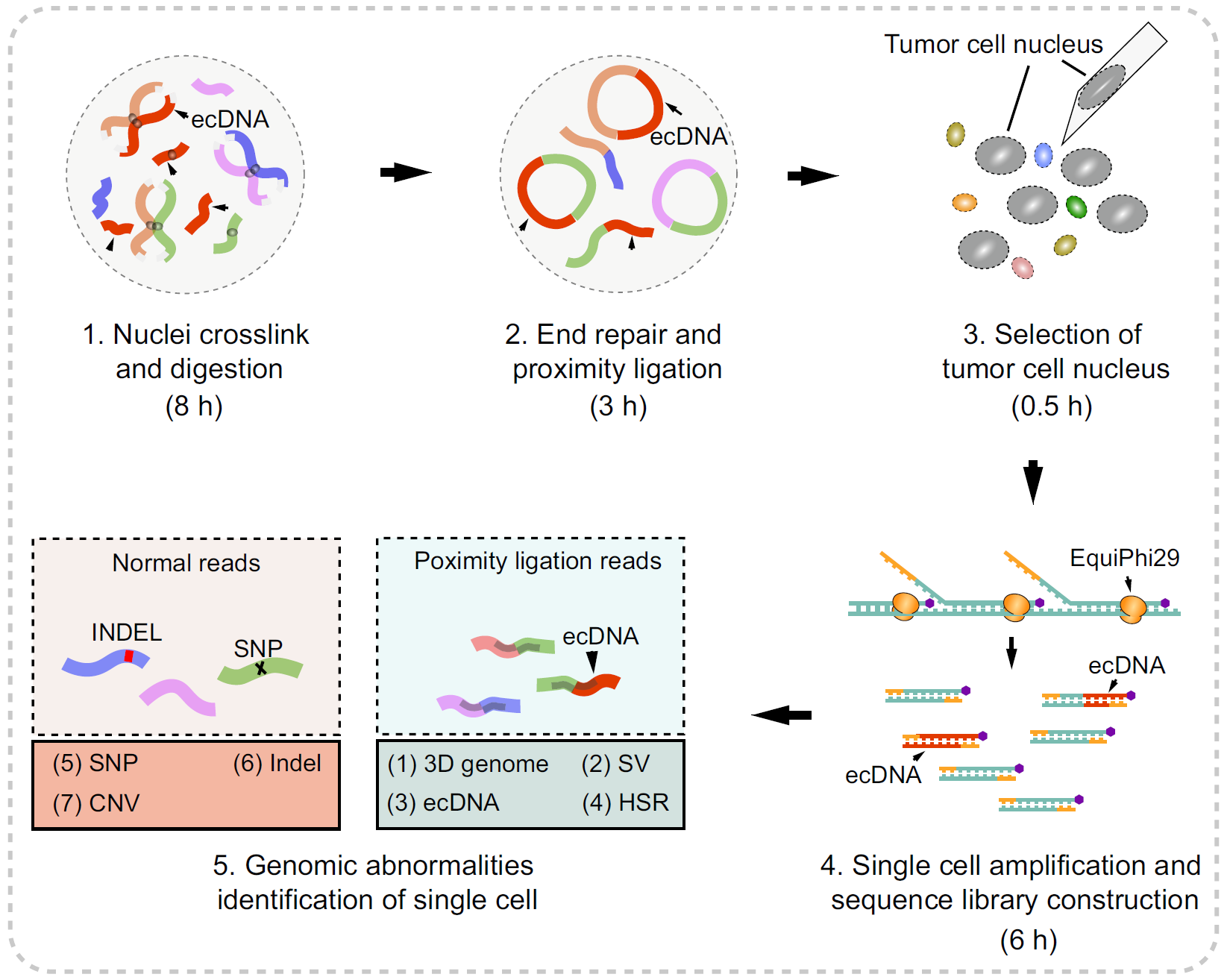 近日,中國科學(xué)院廣州生物醫(yī)藥與健康研究院譜系基因組多維技術(shù)研究組林達(dá)研究員在Nature Communications期刊發(fā)表研究成果,報道了新開發(fā)的單細(xì)胞多組學(xué)技術(shù)-Uniform Chromosome Conformation Capture(Uni-C)。該方法可在一個細(xì)胞中同時解析基因組大尺度結(jié)構(gòu)變異(如SV、CNV、ecDNA)、小尺度突變(SNP/INDEL)以及染色質(zhì)三維構(gòu)象,實(shí)現(xiàn)高分辨率、多維度的聯(lián)合分析(圖1)。