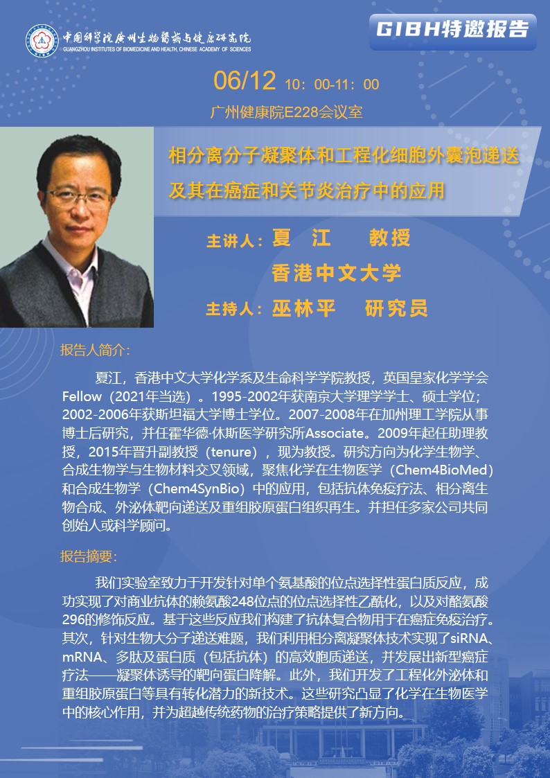 2025年6月12日特邀報告:相分離分子凝聚體和工程化細(xì)胞外囊泡遞送及其在癌癥和關(guān)節(jié)炎治療中的應(yīng)用